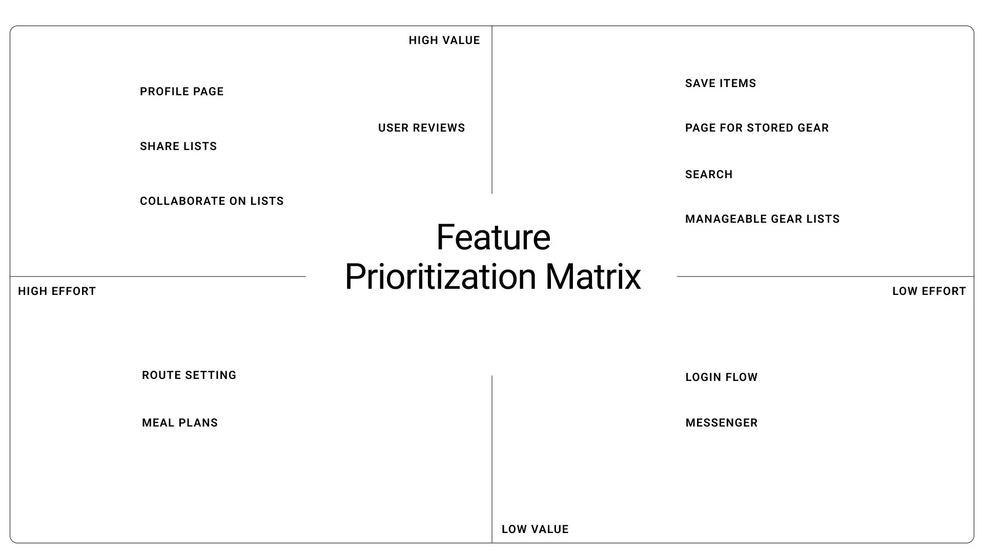 The key features for the first iteration were determined using an Effort vs. Impact Matrix. The features in consideration were influenced by the competitive analysis, but solidified by the motivations and pain points of our users, as identified in our two rounds of user interviews.