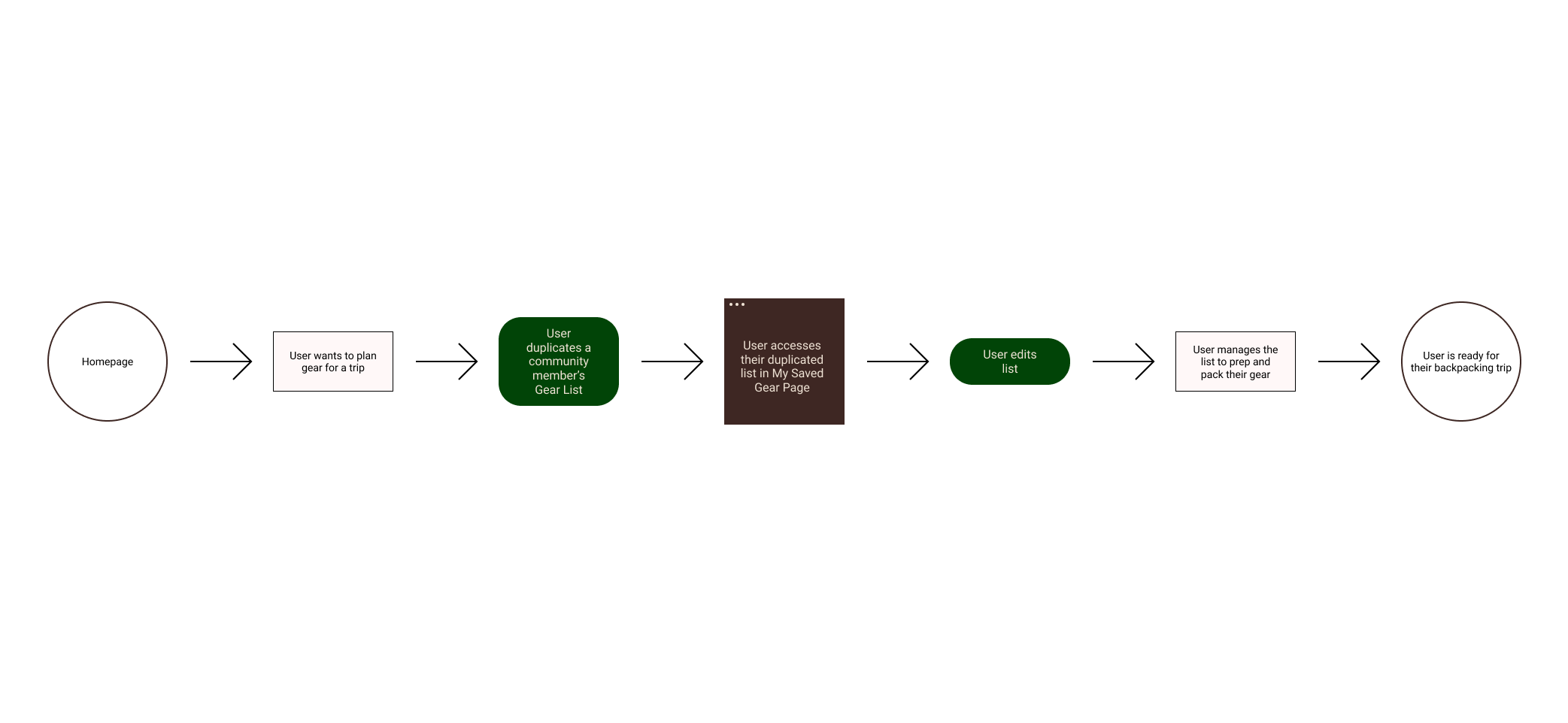 The user research determined that users named gear as the most important aspect of a backpacking trip. Once your gear is dialed in, you can achieve wonders. Three flows were generate to capture the a users journey in planning for gear on the Word of Mouth app.
