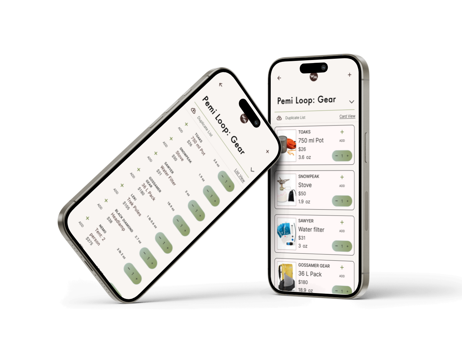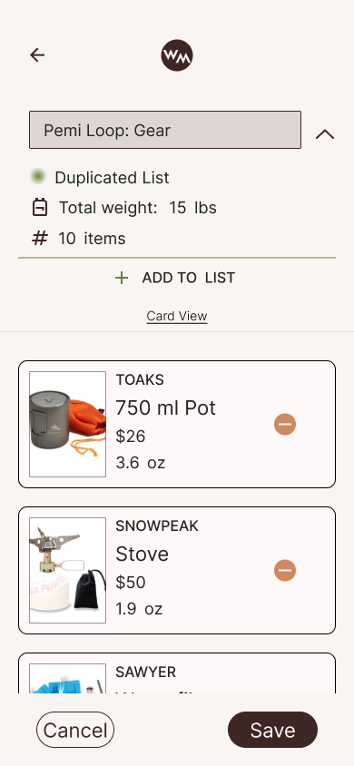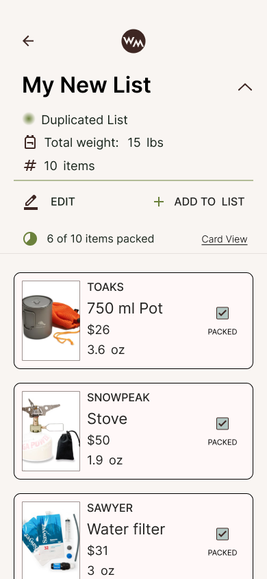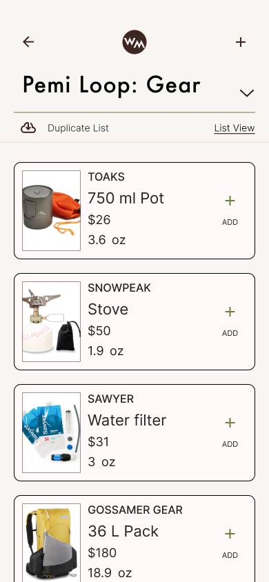 Users are able to browse, create, or duplicate community gear lists. Backpackers can seamlessly plan their packs, edit quantities with automated pack weights, and check off their pack list as they go.