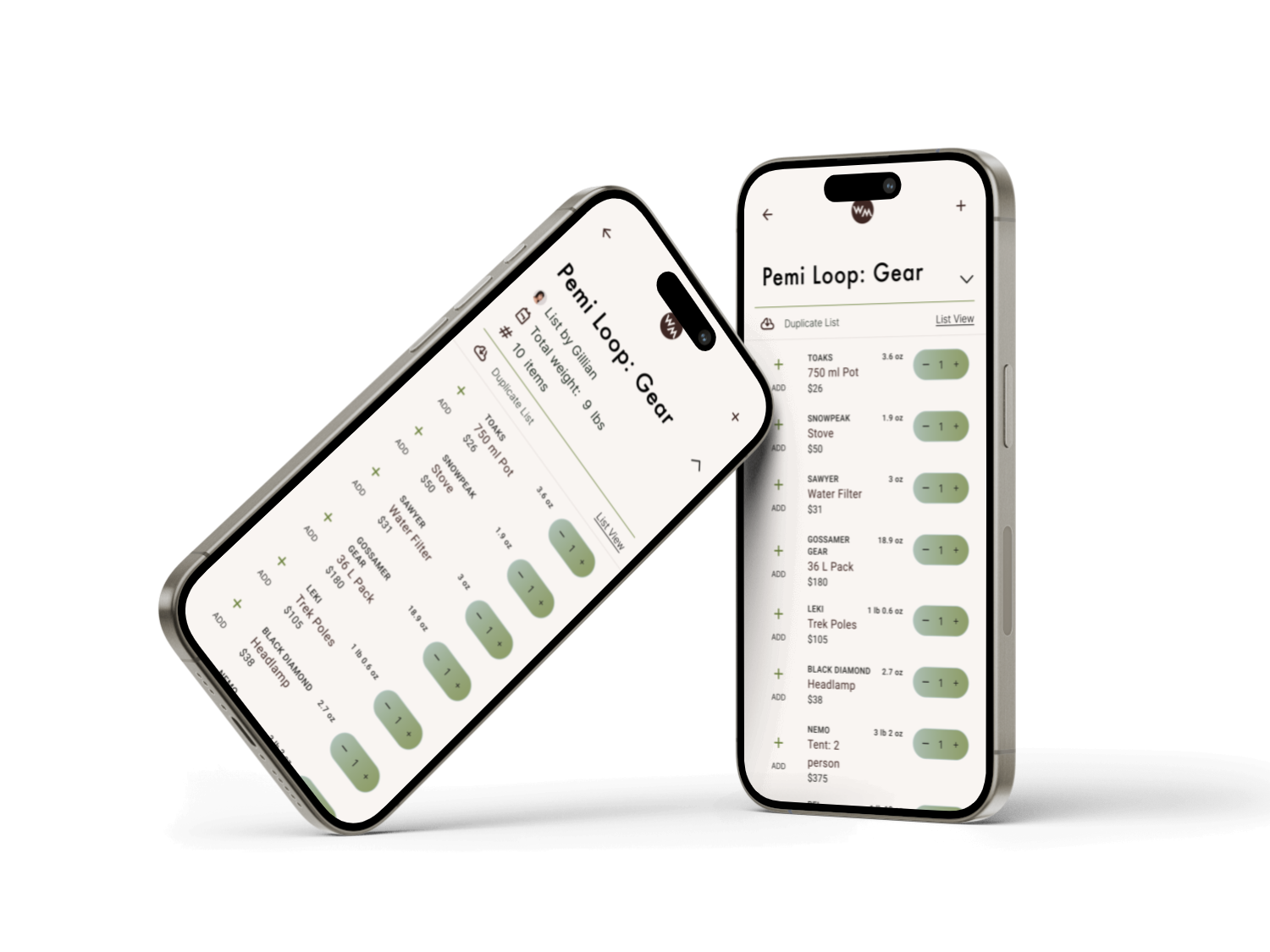 The high fidelity wireframes explore a simple, focused design to mirror backpacker culture: achieving the most with the simplest set up. We integrated the use of gear lists with weight for each item and total list weight. The ability to check off packed items, and edit gear list names and item quantities with ease. The overall design nods to analog lists, and the apps primary function: support users in planning their gear for different treks.