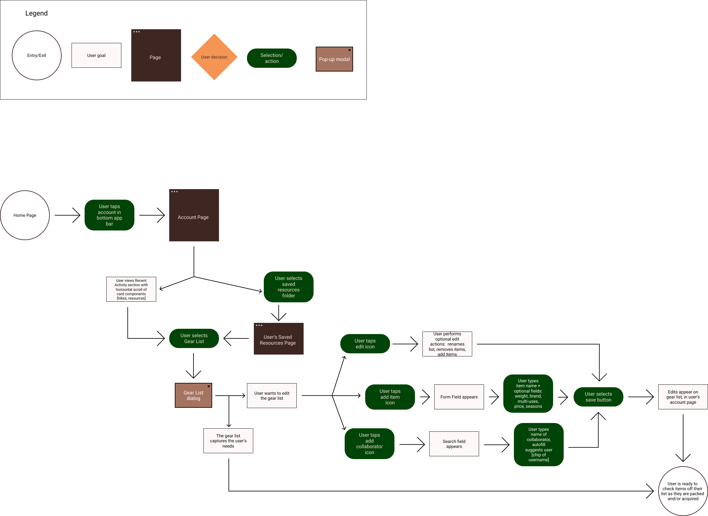 The Manage Gear List User Flow: This flow explored the actions a user will take to manage their gear list for use. This includes editing functions, checklist functionality, and editing content with form fields.