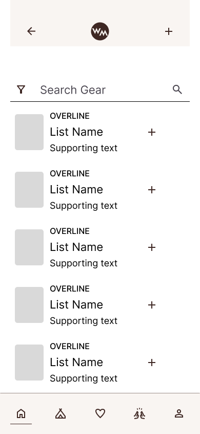 The low fidelity wireframes came to life over several iterations. Each version focused on simplifying the steps users need to access gear lists, while maintaining an atmosphere that users find motivating to browse. Ultimately, the iterations manifested as the screens outlined below.