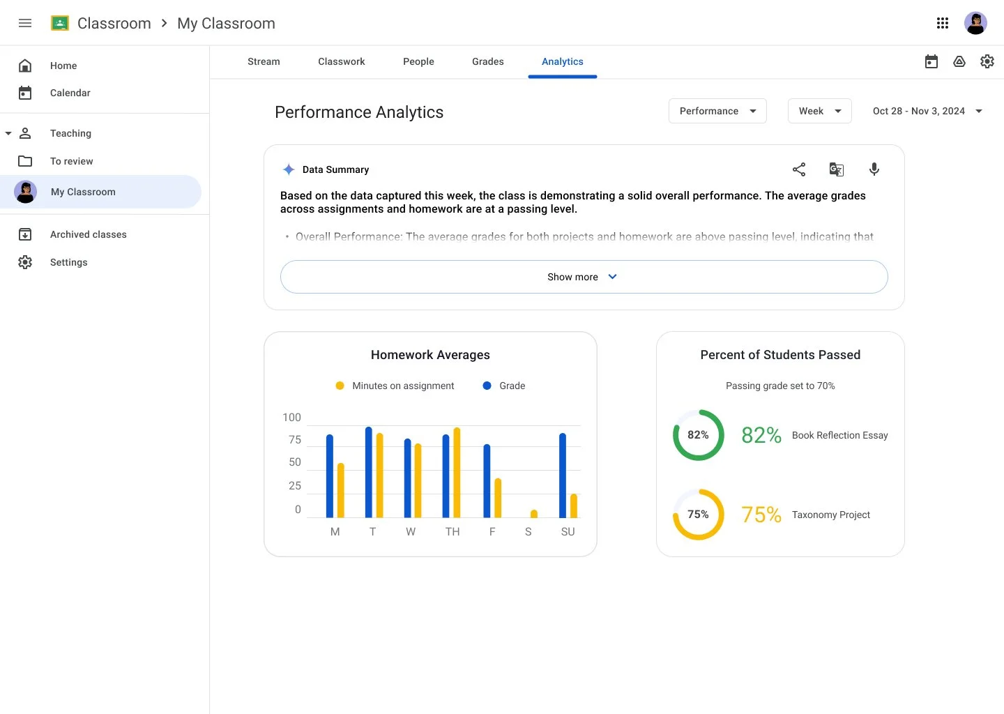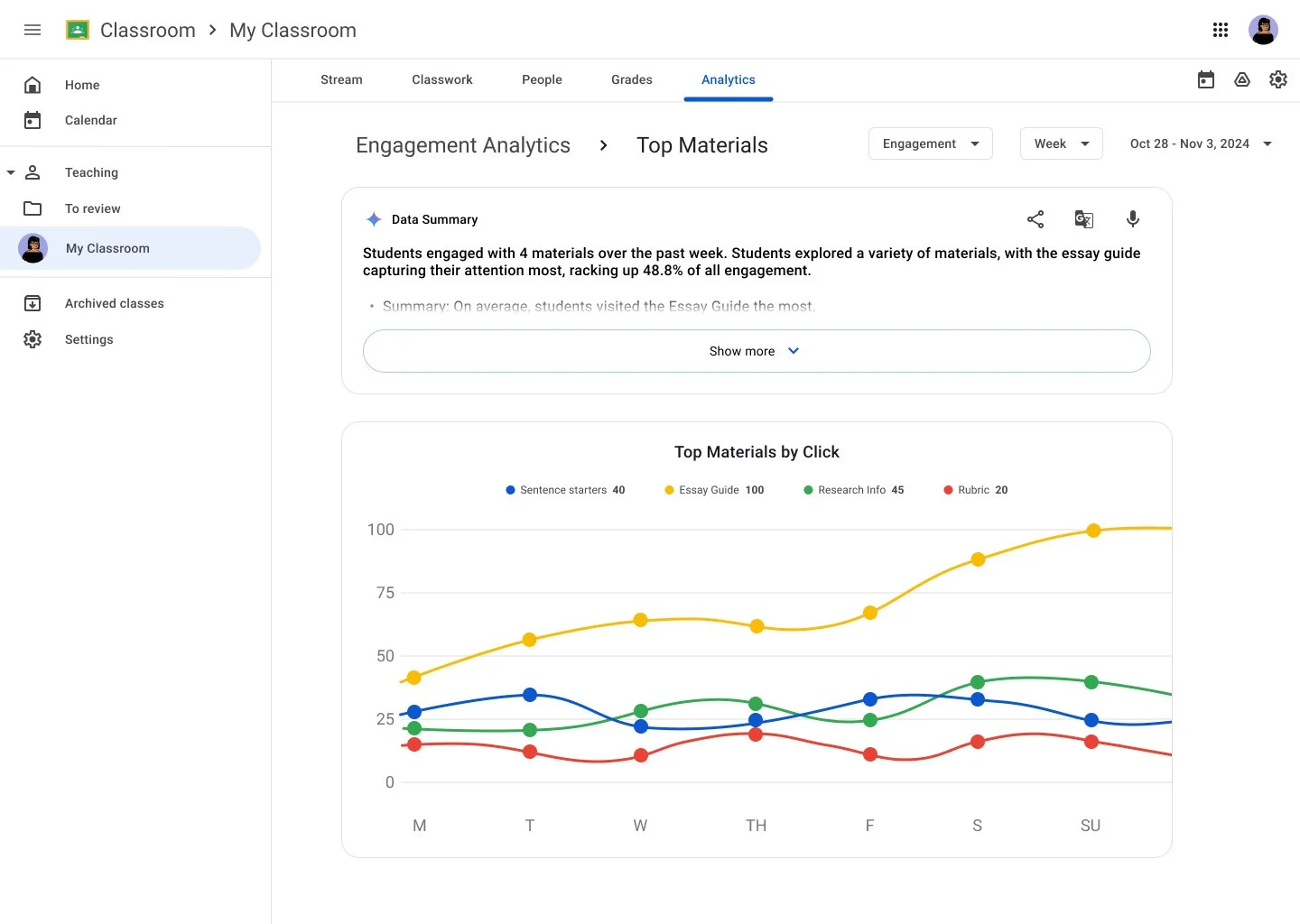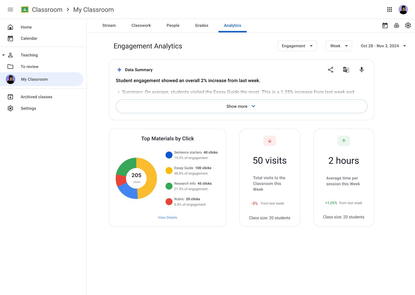 Google Classroom is a Learning Management System (LMS). We added an analytics tab to help educators view and analyze data on students’ engagement and approach to learning.