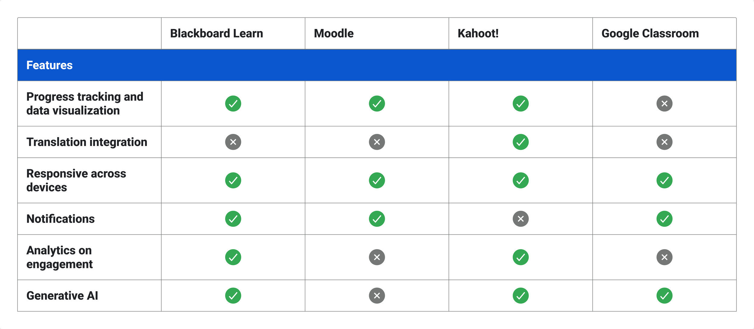 The competitor analysis focused on the key features of learning management systems mentioned by educators in the user interviews. In addition to the feature audit visualized on the right, I conducted an in-depth competitor analysis. Select the Figma button below to view.
