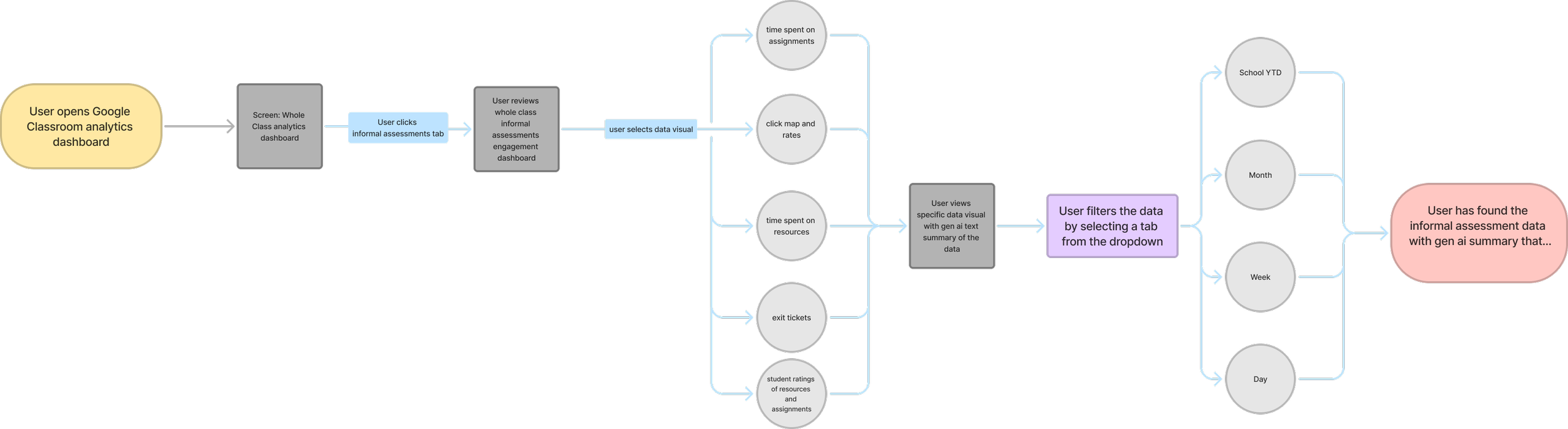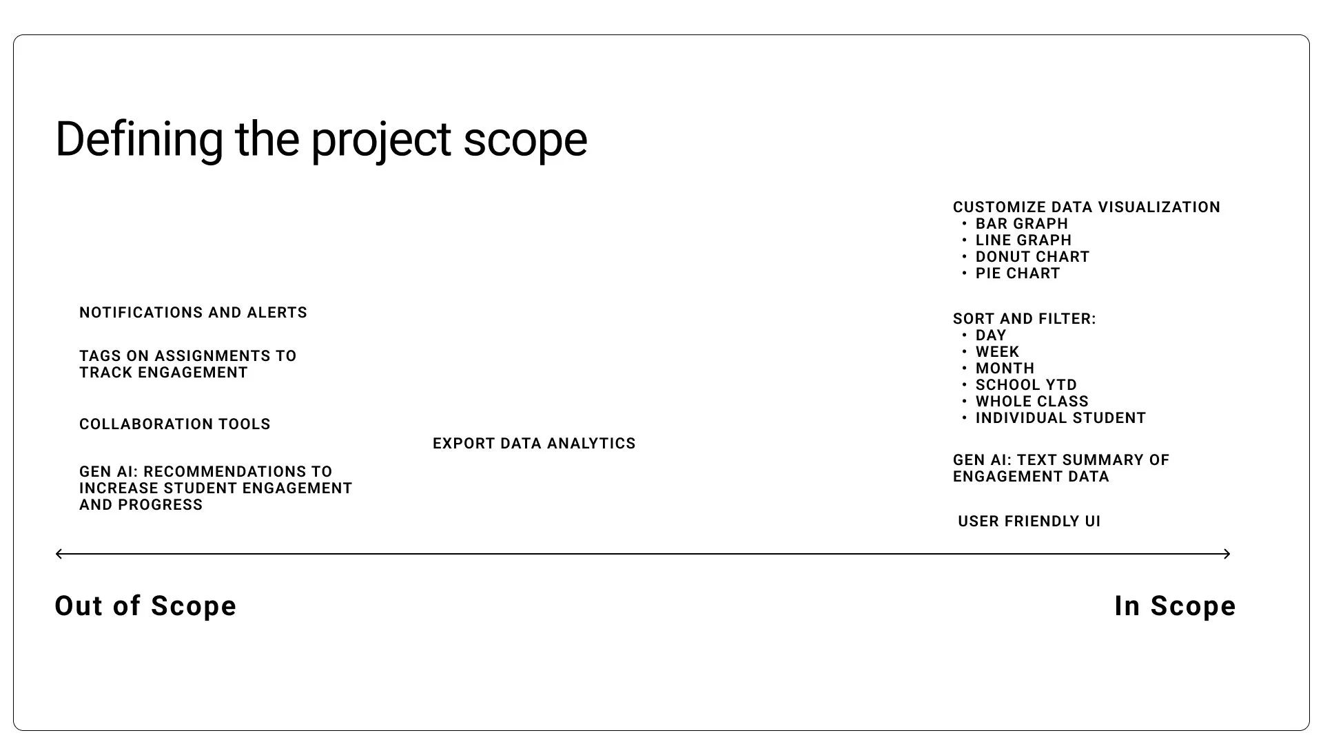 The user research and project scope ultimately determined that Google Classroom educators need access to comprehensive data visualizations and summaries of student engagement.