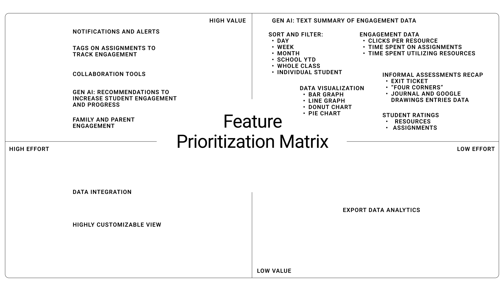 The primary functionalities for the additional Google Classroom feature were established through an Effort vs. Impact Matrix. These features were shaped by competitive analysis but were ultimately refined by understanding the motivations and pain points of our users, as revealed through user interviews and research synthesis.