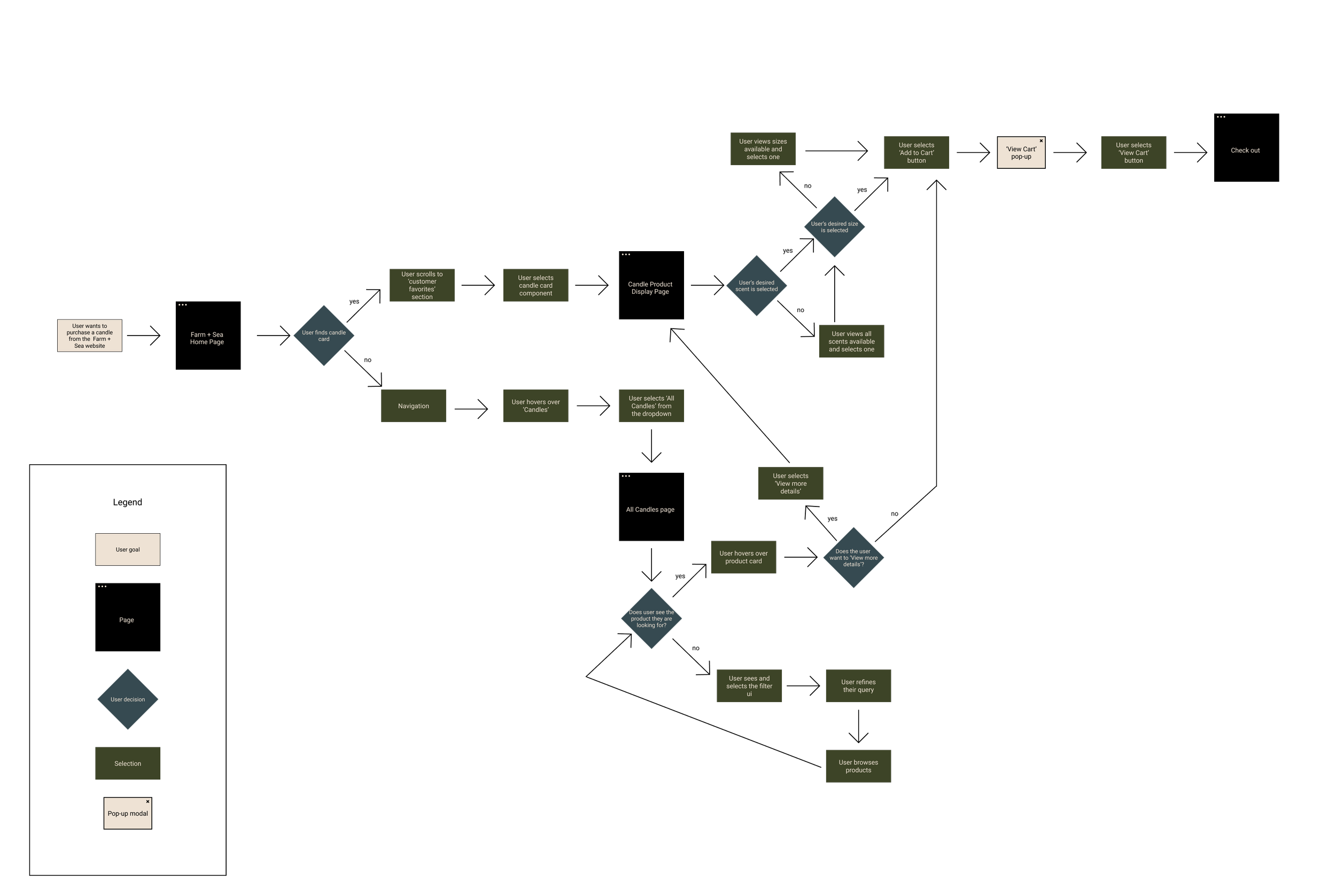 The user research determined that users are commonly logging on to the Farm + Sea website to browse items, view information about products, and add an item to cart. This was illustrated in the User Journey deliverable, and all paths were explored in the User Flow.
