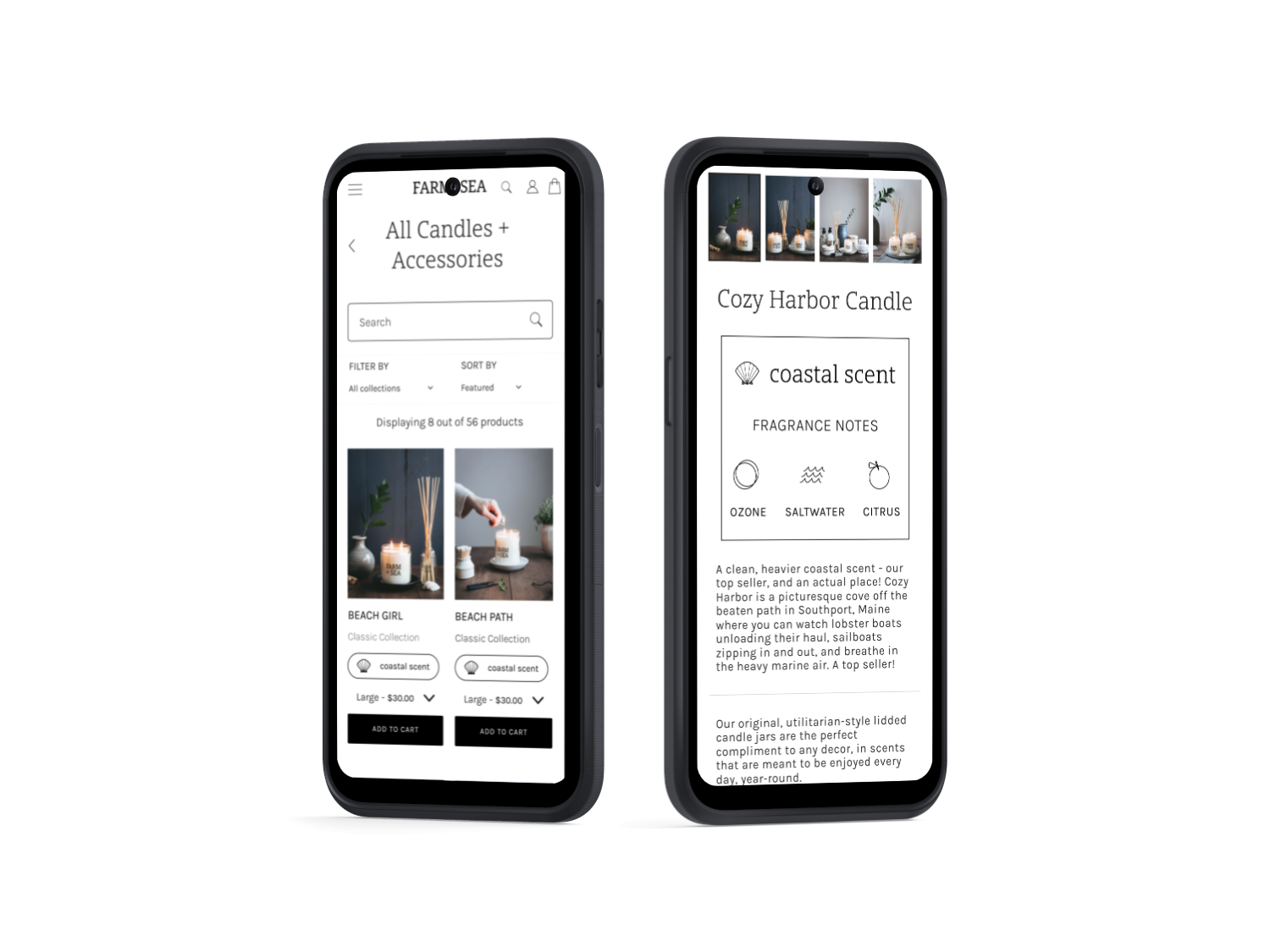 The intent of this project is to create a digital experience with virtual ambiance that is reflective of Farm + Sea’s brand values and essence. As a company specializing in a large variety of fragranced products, users experience challenges in browsing the large quantity of inventory. The website’s current ui limits users’ browsing to a dropdown menu within the product page. Based on initial research and an analysis of competitor’s websites, this dropdown ui may influence users to experience analysis paralysis. The ui and information architecture must support users in accessing the total inventory while maintaining mobile device compatibility, in consideration of the 60.45% of users accessing the content via mobile.